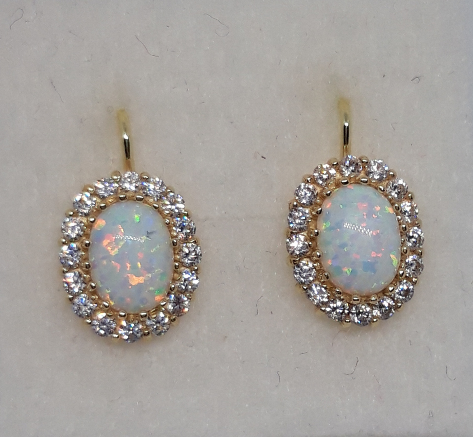 Náušnice ze žlutého zlata ryzosti 585/1000 s bílými kamínky a bílým opálem
